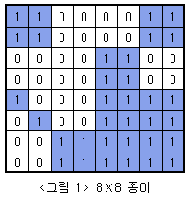아래 <그림 1>과 같이 여러 개의 정사각형칸들로 이루어진 정사각형 모양의 종이가 주어져 있고, 각 정사각형들은 하얀색으로 칠해져 있거나 파란색으로 칠해져 있다. 주어진 종이를 일정한 규칙에 따라 잘라서 다양한 크기를 가진 정사각형 모양의 하얀색 또는 파란색 색종이를 만들려고 한다.