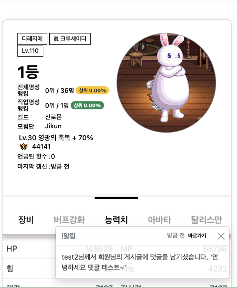 - 캐릭터 정보 불러올시에 스프링 Async 기능을 이용해 비동기처리로 받아오도록 구현했다. (속도가 조금 빨라졌으려나..? 실감이 되지 않아서 불안정한 작업을 할 바엔 돌려놓는게 좋겠다라는 생각으로 두고보고있다. 하지만 캐릭터 정보는 내가 처리하는 데이터가 아닌 외부에서 안전한 데이터를 가져오는것이니.. 아직 확실하지 않다.)
