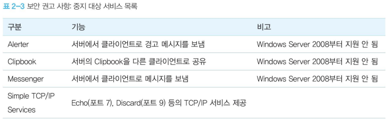 - 보안 가이드에서 권고되는 중지 대상 서비스를 제거