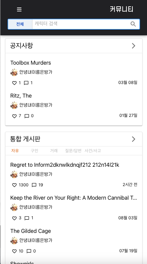 - 게시글에 캐릭터 링크 후 클릭 시 해당 캐릭터가 등록된 게시글 혹은 캐릭터 정보 상세보기 조회 가능