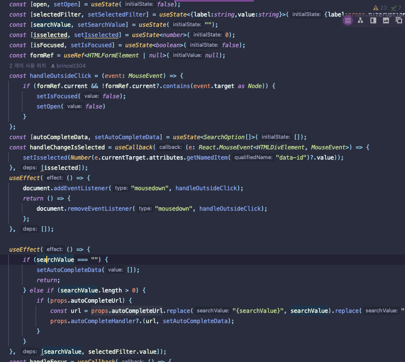 - 하나의 컴포넌트를 통으로 렌더링 하는게 아닌 하나의 div 에 여러개의 div 가 들어가있는 형식이라 이때 검색 창의 외부를 클릭시에 옵션창이 사라진다던지, 옵션창이 나와있는데 셀렉트박스를 누르면 사라졌다가 셀렉트 박스가 닫혀지면 다시 나타난다던지 하는 로직을 구현하는데 머리를 많이 썼다.