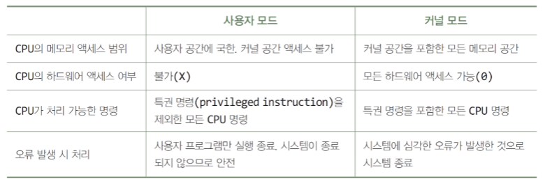 - CPU는 사용자 모드와 커널 모드 중 한 모드로 실행한다.