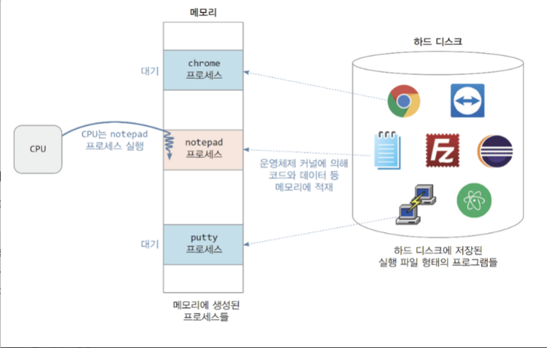 - 운영체제는 프로그램을 메모리에 적재하고 프로세스로 다룬다.